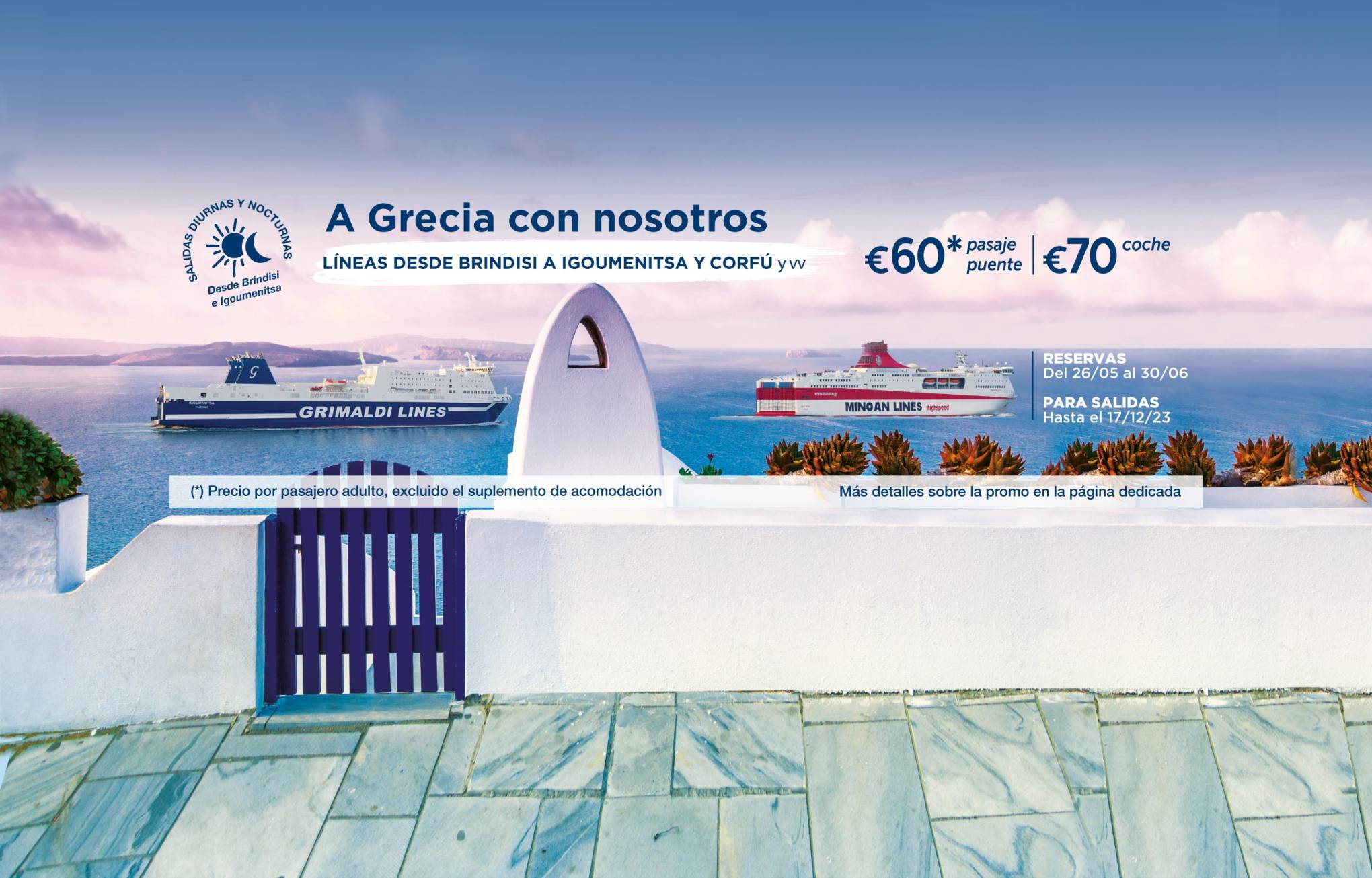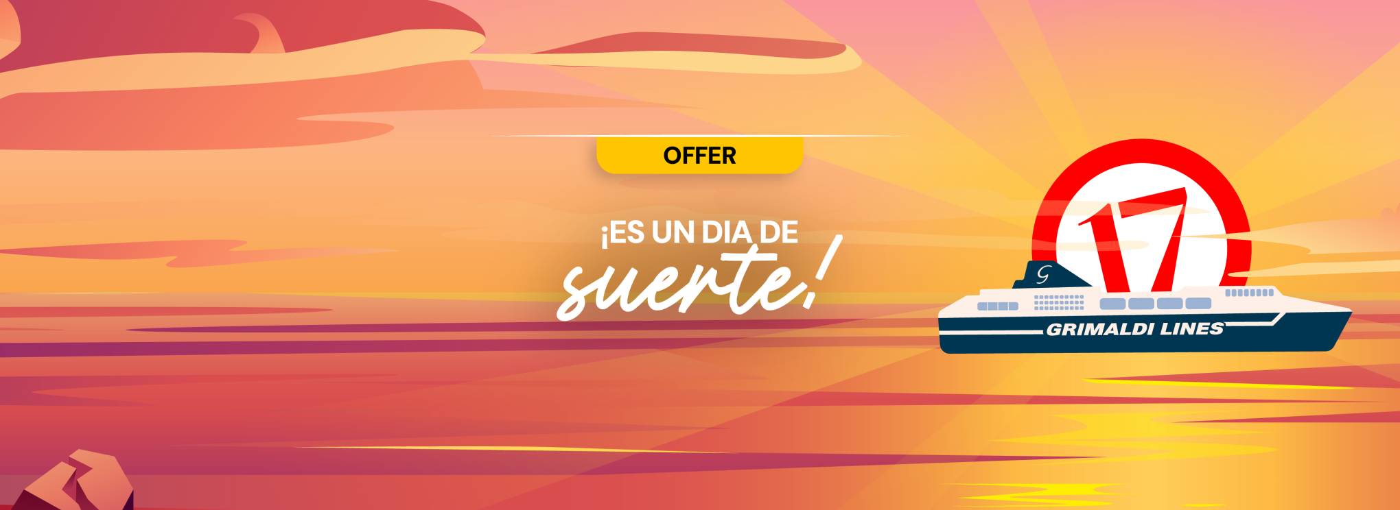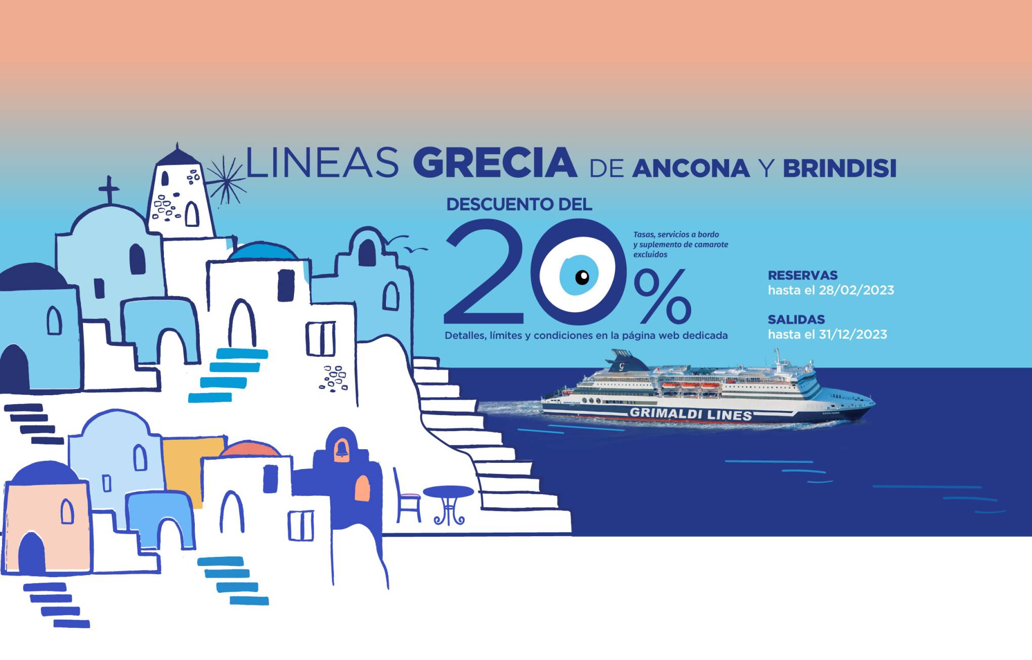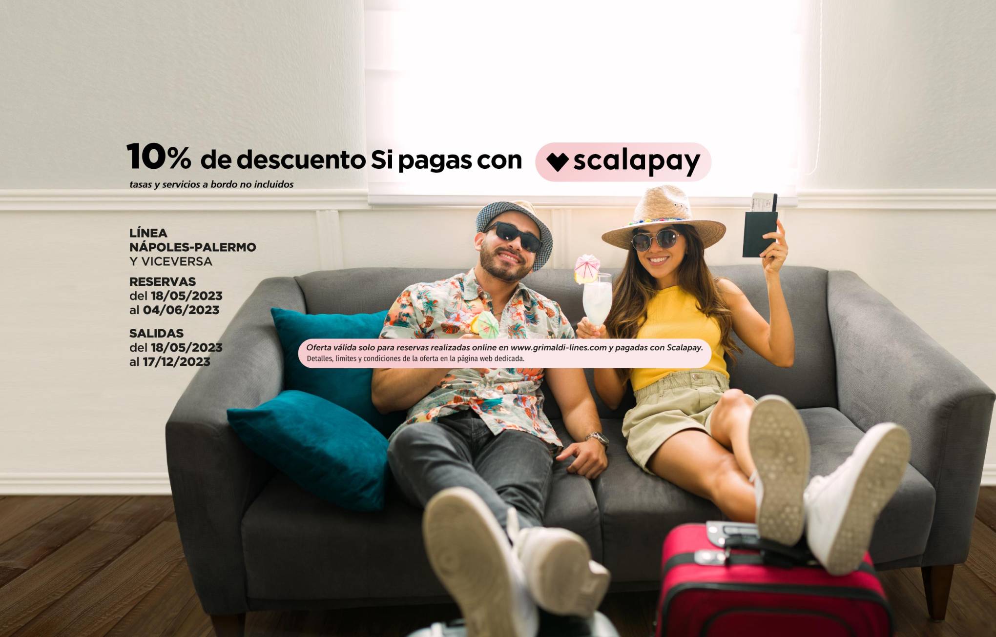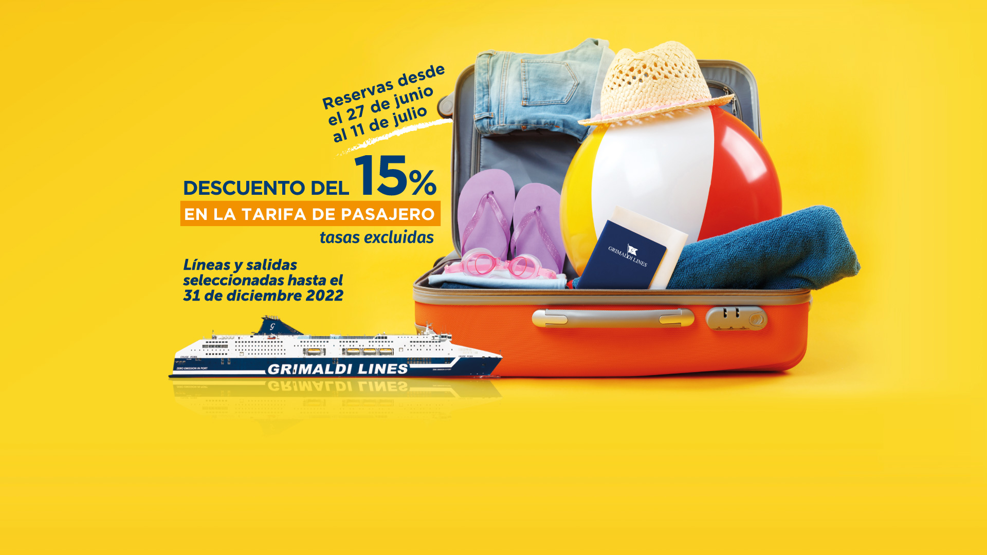 Las salidas hasta el 31/05/2026 y del 01/10/2026 al 31/12/2026 están operadas por otra compañía naviera. Las reservas se realizan mediante la redirección a la página web de la mencionada Compañía y con las condiciones allí establecidas. Para cancelar / cambiar el billete y para cuestiones relacionadas con el servicio (por ejemplo, asistencia e información a los pasajeros o reclamaciones), se ruega ponerse en contacto con la compañía operadora mencionada anteriormente. Si desea comprar un billete de ida y vuelta que incluya diferentes rutas o fechas en las que operan compañías diferentes, puede comprar dos billetes independientes o bien contactarnos al +39 081 49644 o al correo electrónico info@grimaldi.napoli.it