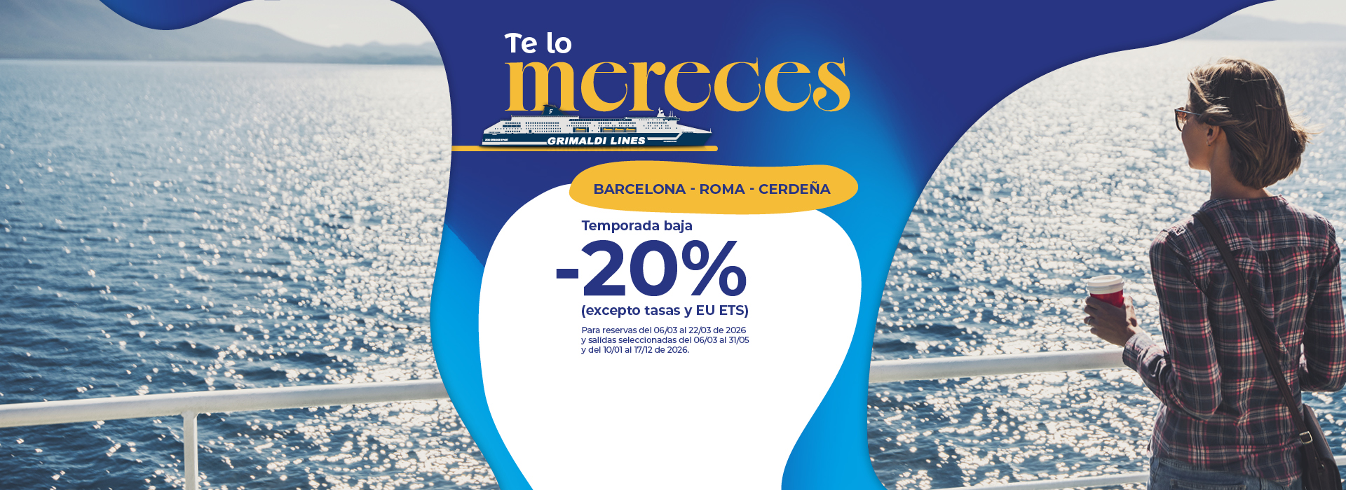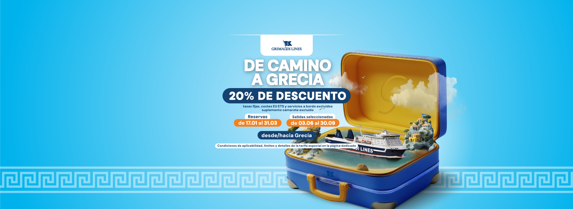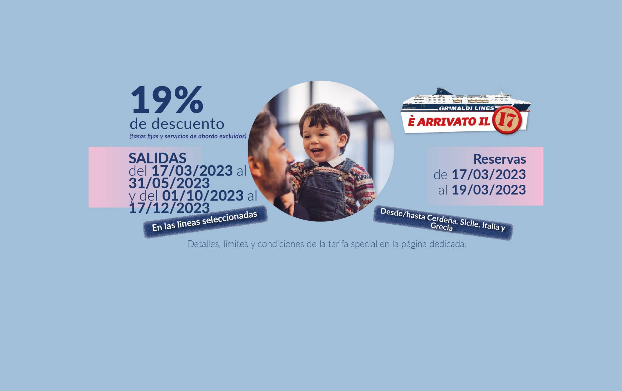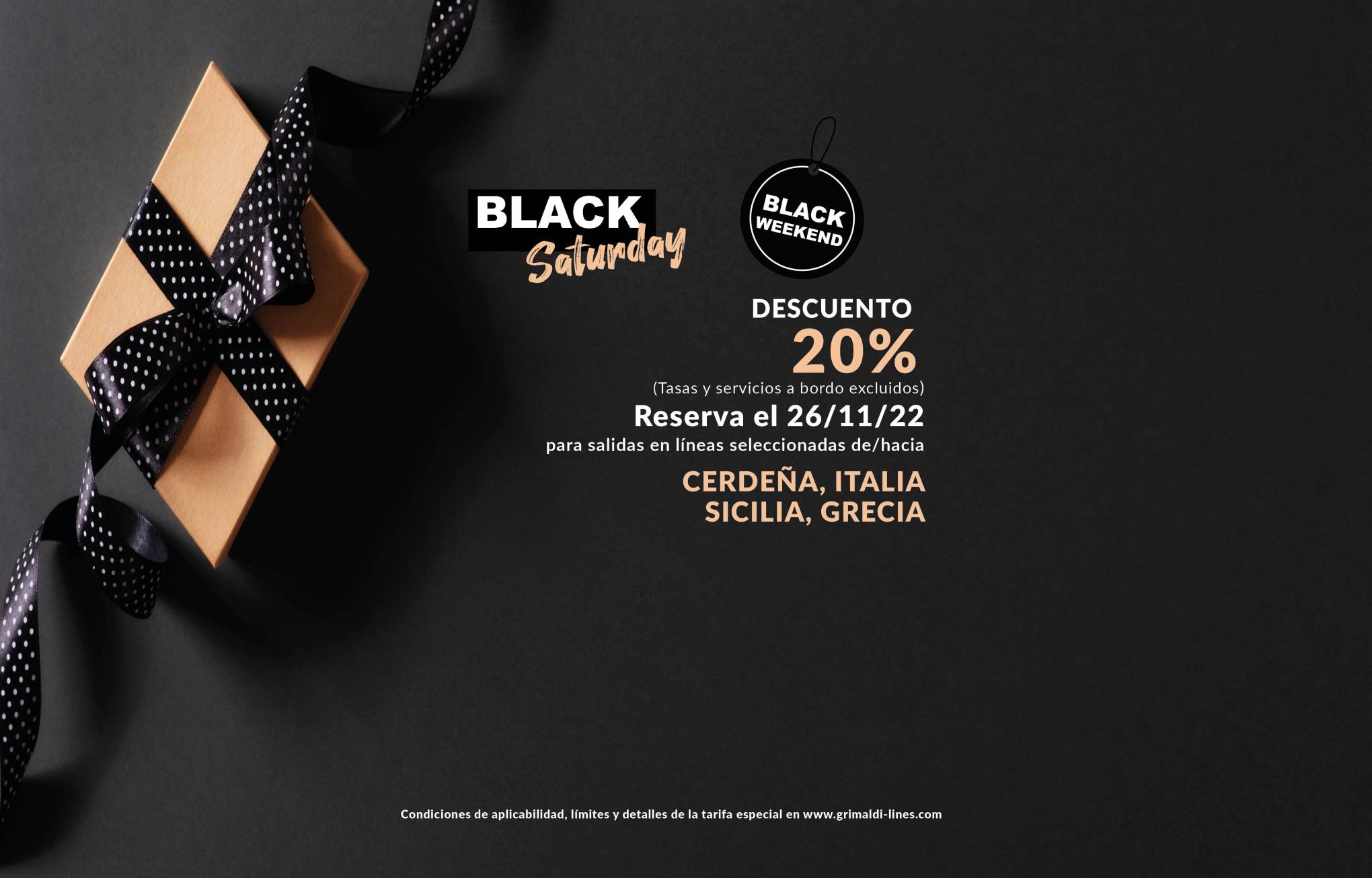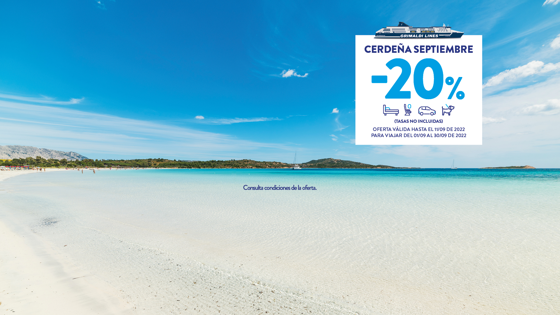 Las salidas hasta el 31/05/2026 y del 01/10/2026 al 31/12/2026 están operadas por otra compañía naviera. Las reservas se realizan mediante la redirección a la página web de la mencionada Compañía y con las condiciones allí establecidas. Para cancelar / cambiar el billete y para cuestiones relacionadas con el servicio (por ejemplo, asistencia e información a los pasajeros o reclamaciones), se ruega ponerse en contacto con la compañía operadora mencionada anteriormente. Si desea comprar un billete de ida y vuelta que incluya diferentes rutas o fechas en las que operan compañías diferentes, puede comprar dos billetes independientes o bien contactarnos al +39 081 49644 o al correo electrónico info@grimaldi.napoli.it