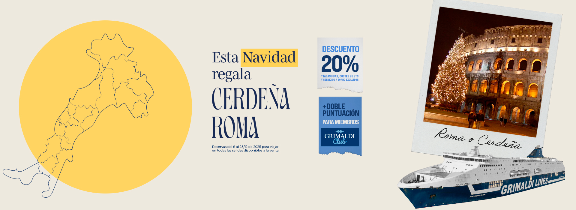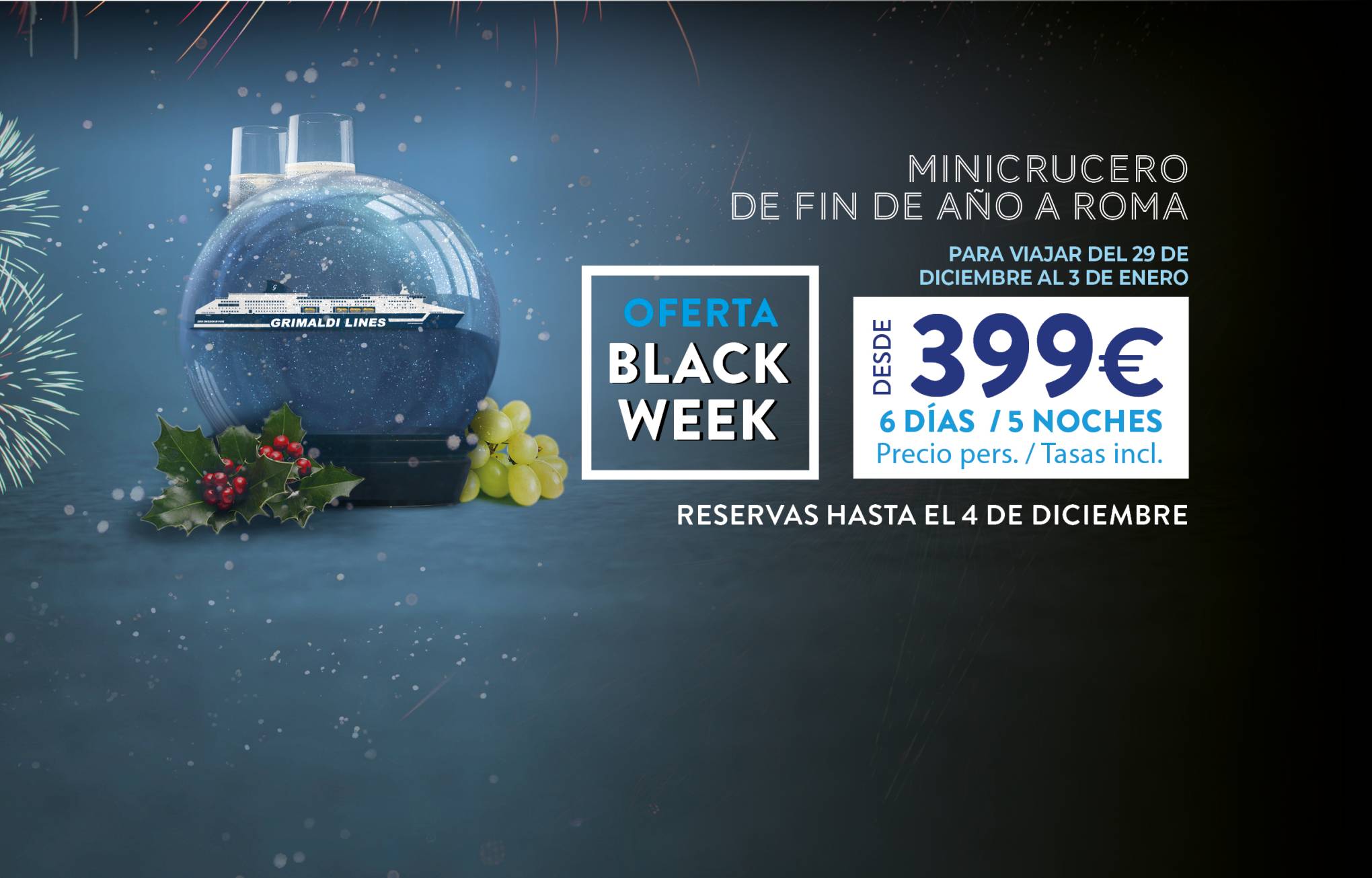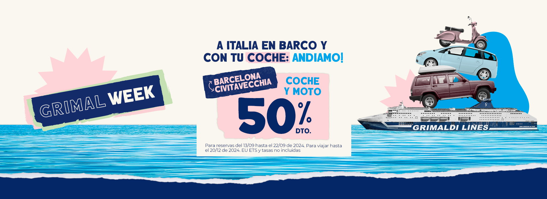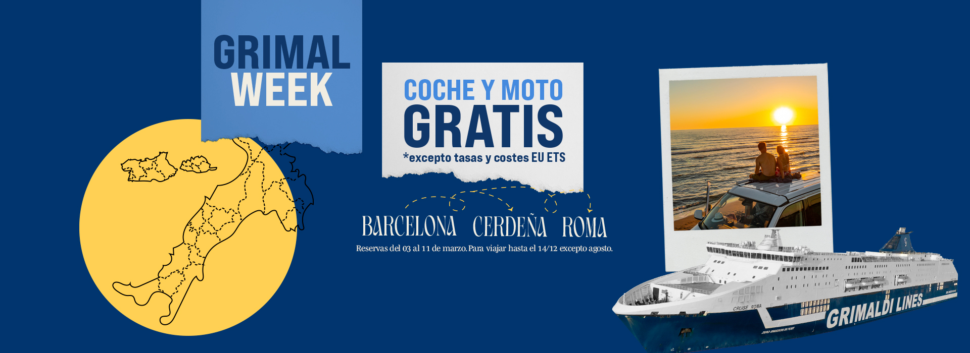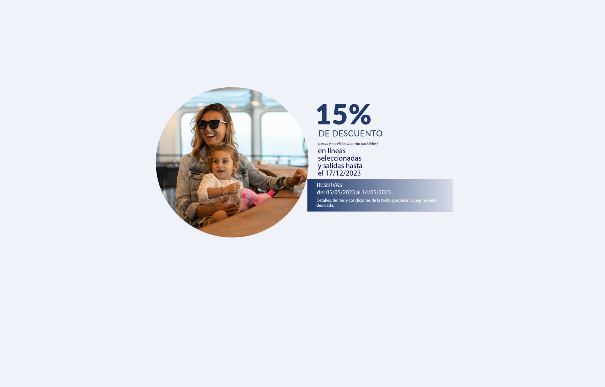 Las salidas hasta el 31/05/2026 y del 01/10/2026 al 31/12/2026 están operadas por otra compañía naviera. Las reservas se realizan mediante la redirección a la página web de la mencionada Compañía y con las condiciones allí establecidas. Para cancelar / cambiar el billete y para cuestiones relacionadas con el servicio (por ejemplo, asistencia e información a los pasajeros o reclamaciones), se ruega ponerse en contacto con la compañía operadora mencionada anteriormente. Si desea comprar un billete de ida y vuelta que incluya diferentes rutas o fechas en las que operan compañías diferentes, puede comprar dos billetes independientes o bien contactarnos al +39 081 49644 o al correo electrónico info@grimaldi.napoli.it